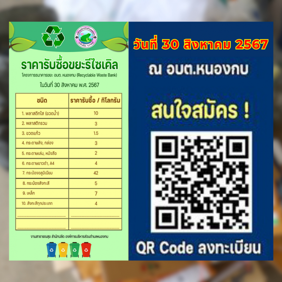 ธนาคารขยะองค์การบริหารส่วนตำบลหนองกบ รับซื้อขยะรีไซเคิ้ล ในวันศุกร์ที่ 30 สิงหาคม พ.ศ. 2567